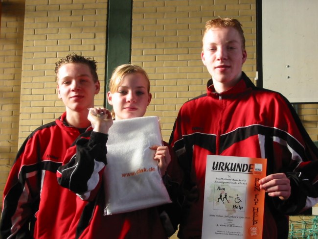 | 06.12.03 | Run for Help Staffellauf Beim Run for Help am 07.12.03 von Stikelkamp nach Brinkum werden folgende Staffeln an den Start gehen: – Frank de Freese und Friedhelm Saathoff in der Männer Hauptklasse – Jan-Gerhard, Heinz-Helmut und Griet-Mara Onken in der Familienwertung – Simon Grüssing, Jan-Hiebo Busch und Manuel Horn in der Schülerwertung – Rolf läuft in der Familienwertung der Steinkes |