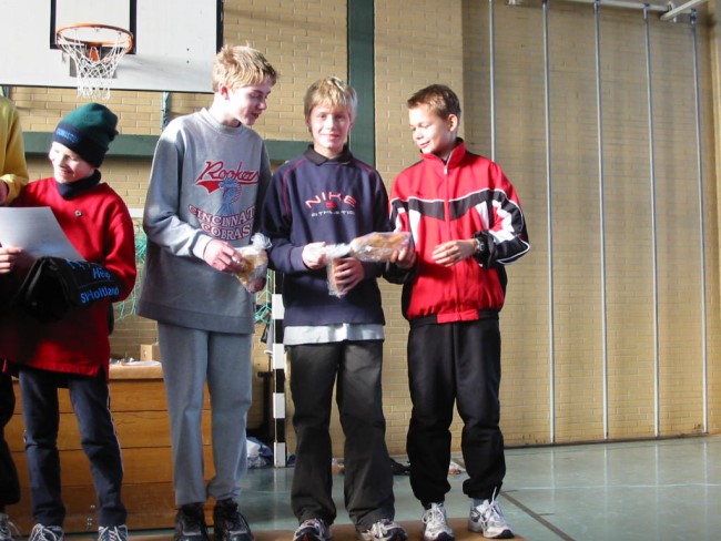 | 19.01.03 | Weser-Ems-Meisterschaften Cross in Lingen Bei den Crossmeisterschaften des Bezirkes belegte Michael Brauner einen guten vierten Platz. Frank de Freese wurde achter. Heinz-Helmut Onken wurde in der B-Jugend elfter. Aufgrund einer bei den Hallenmeisterschaften in Emden erlittenen Verletzung fehlte ihm leider die Kraft beim Finish. Die Läufer auf den Plätzen sechs bis elf lieferten sich einen packenden Endspurt. Im Rahmenwettbewerb belegte Simon Grüssing bei den Schülern B einen zweiten Platz. Er wurde im Endspurt nur knapp geschlagen. |