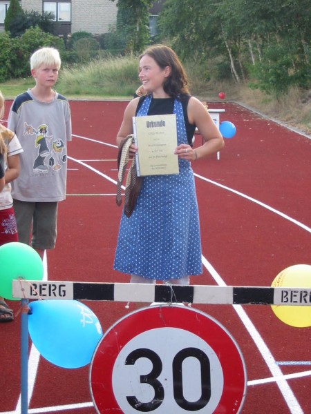 | 03.06.03 | Bezirksmeisterschaften Schüler/-innen A in Norden am 06.06.03 Folgende Athleten werden an den Start gehen: Steffen Wiechmann über 1.000 m; Jan-Gerhard Onken über 100 m und 1.000 m; Christian de Buhr im Kugelstoßen, Speerwurf und Diskuswurf; Maria Harms über 80 m Hürden, 300 m, im Hochsprung und Weitsprung; Daniela Manssen über 80 m Hürden, im Hochsprung und Speerwurf; Sarah Pommer im Kugelstoßen, Speerwurf und Diskuswurf; Griet-Mara Onken über 800 m, 80 m Hürden und im Weitsprung; Saskia Willms über 100 m, im Kugelstoßen und im Speerwurf und Martina Männich im Hochsprung und im Speerwurf. Zudem tritt eine 4 x 100 m Staffel der Schülerinnen an. |