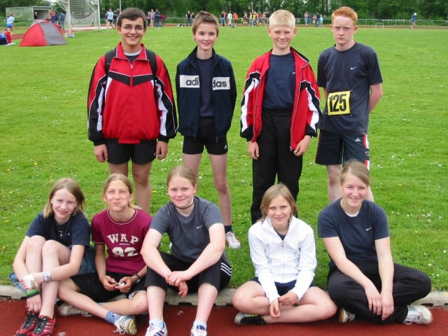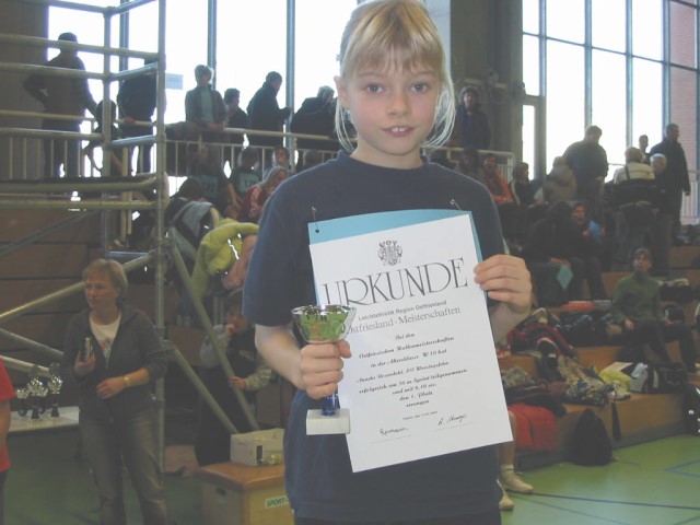 27.06.06 | Ergebnisse von den Regionsmeisterschaft in Emden Bei den Regionsmeisterschaften in den Einzeldisziplinen der Schüler/-innen C in Emden gewann Saskia Luitjens den Titel im 50 m Sprint. In 7,5 Sek fegte sie über die Bahn an der Nordseehalle. Weitere vordere Platzierungen konnten erzielen: 2. Platz: Eelka Bockelmann im Hochsprung mit 1,20 m 3. Plätze: Thilo Steinbach über 1.000 m in 4:30,1 Min., Darja de Buhr über 800 m in 3:06,3 Min., Saskia Luitjens über 800 m in 3:07,6 Min. Franziska de Freese im Ballwurf mit 30,0 m und die 4 x 50 m Staffel mit Franziska de Freese, Eelka Bockelmann, Tomke Müller und Saskia Luitjens. |