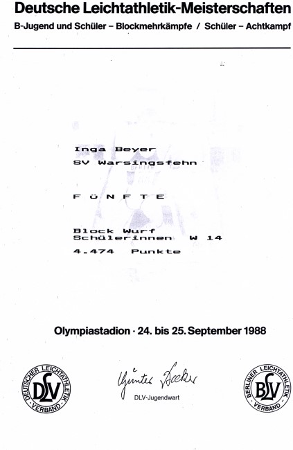 September: Ostfriesicher Rekord durch die Siebenkampf Mannschaft mit Anja und Heike Ramaker und Sandra Brunken mit 10.122 Punkten am 16./17.09.1995 in Zeven