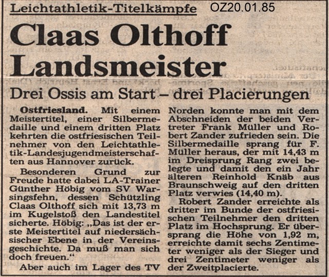 Der Vergleichskampf Ostfriesland/Osnabrück/Nord-Holland wird erstmals seit 17 Jahren wieder veranstaltet. Günther Höbig ist Mitinitiator der Wiederaufnahme des Wettkampfes. Zuletzt fand er 1968 in Aurich statt. Dieses Jahr ist Groningen der Veranstaltungsort.